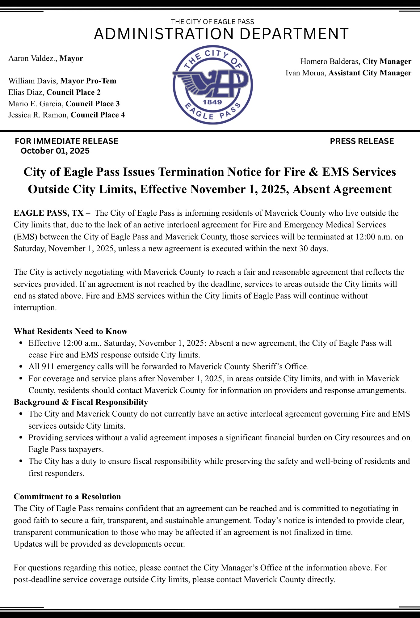 City of Eagle Pass Issues Termination Notice for Fire & EMS Services Outside City Limits, Effective November 1, 2025, Absent Agreement