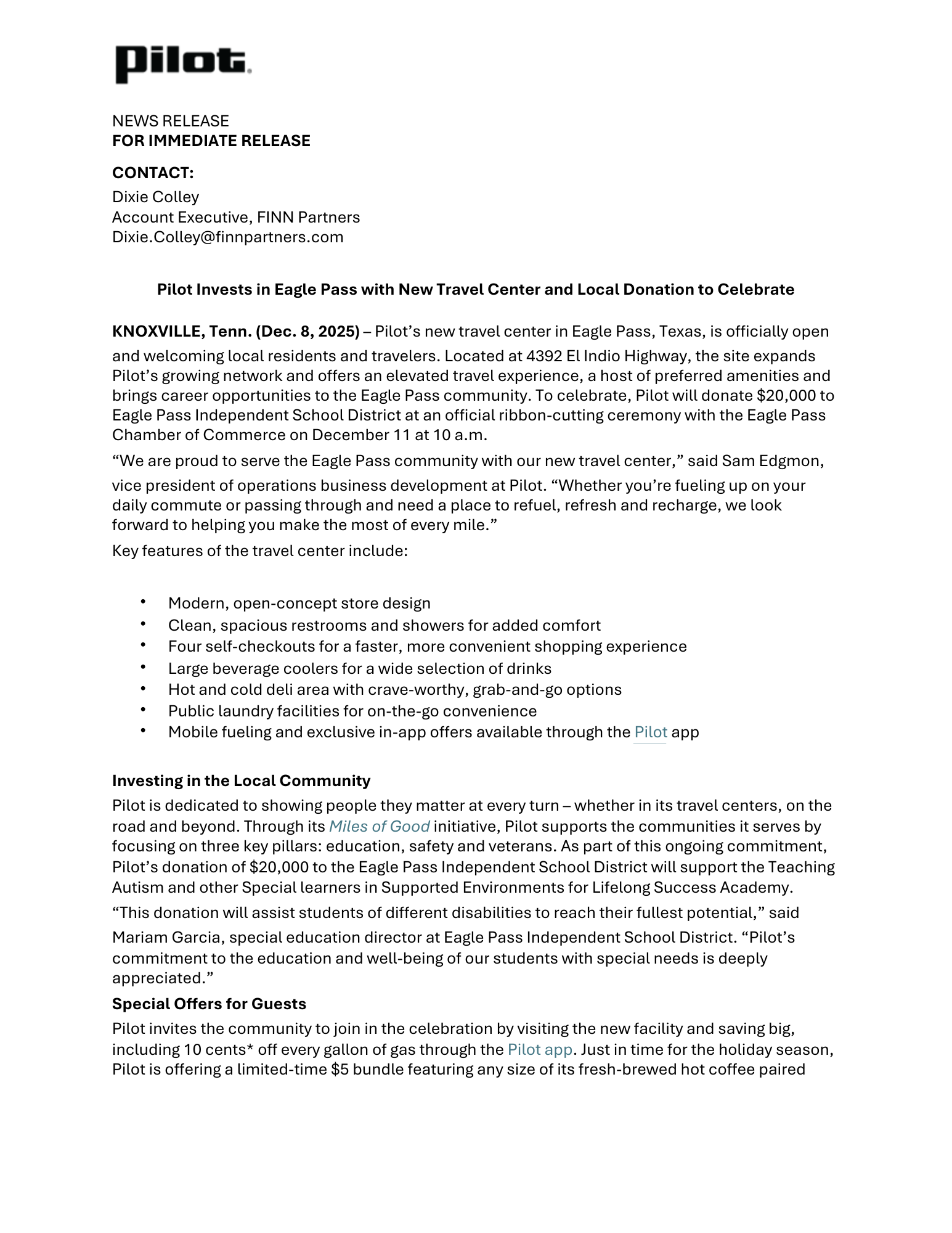 Pilot Invests in Eagle Pass with New Travel Center and Local Donation to Celebrate